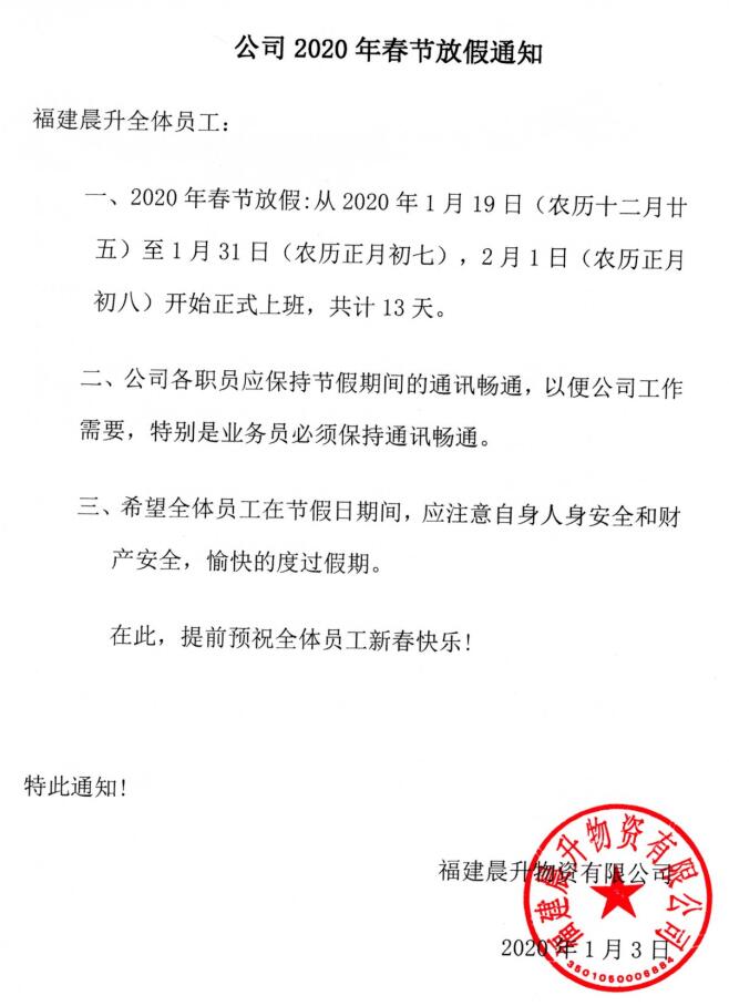 2020年春節放假通知