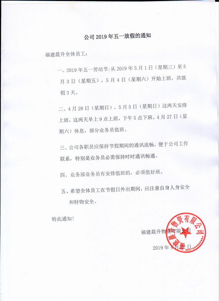 2019年五一勞動節放假通知